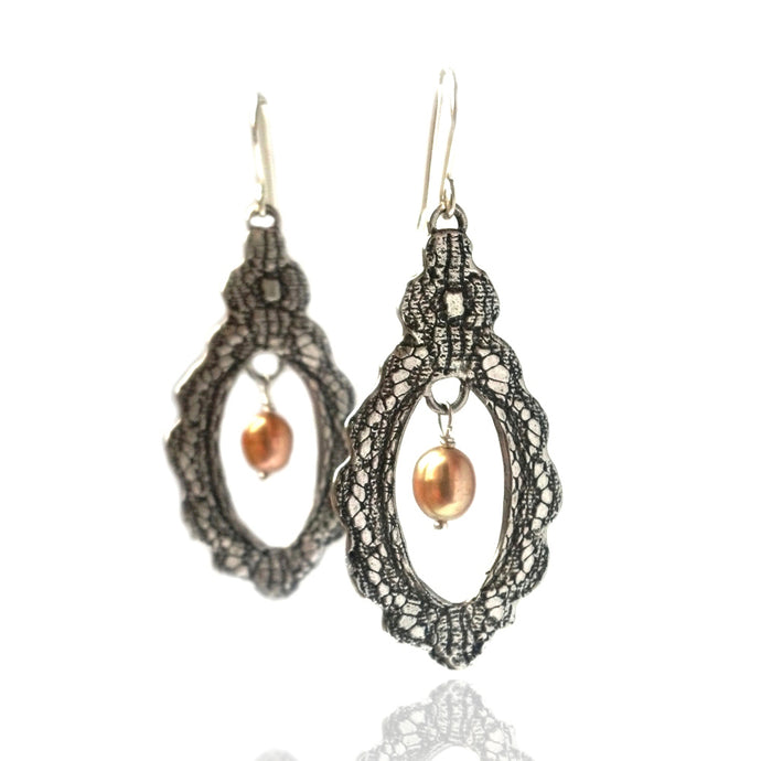 Iolanda's Lace Dangle Earrings in Sterling Silver and Golden Pearl