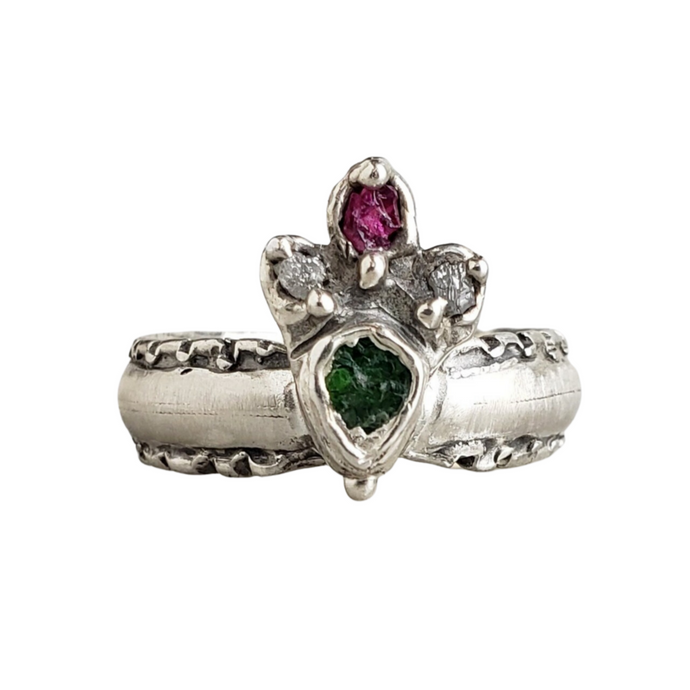 Paisley Crown Ring, Rough Diamond, Ruby and Tsavorite, Silver
